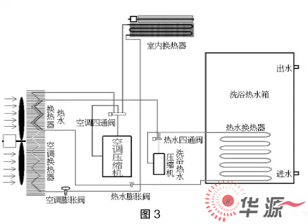 熱泵三聯(lián)供系統(tǒng),概念新穎,所謂空調(diào)模式運(yùn)行時可以加熱洗浴熱水,購買一套三聯(lián)供設(shè)備,可以實(shí)現(xiàn)室內(nèi)制冷、供暖及洗浴熱水??梢越档筒糠殖跬顿Y,但運(yùn)行費(fèi)用與空調(diào)加空氣源熱泵熱水機(jī)的運(yùn)行費(fèi)用是相同的。如下圖2所示: